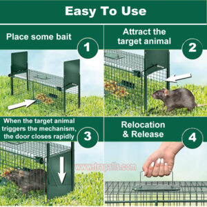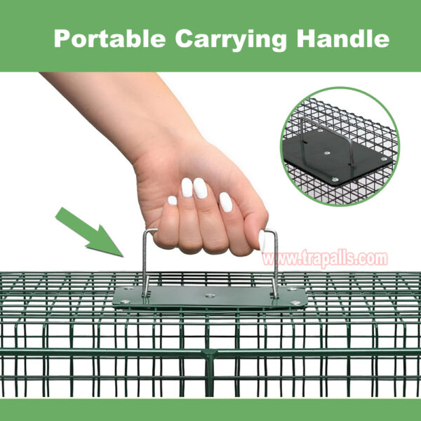 2.Durability. The cage trap is made from zinc plated steel, then powder coated green for excellent rust protection. It is wear-resistant, corrosion-resistant, and built for long-term use,maintaining optimal performance even in demanding outdoor or complex environments