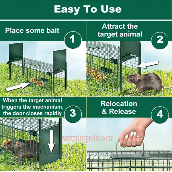 5. Easy to Use. Simply place the appropriate bait at the centre of the trip plate or at one end of the trap (if using 1 entry), open the trigger door and place the trap in the desired location. Animals entering the trap stand on the trip plate, the drop down doors close immediately, trapping the animal