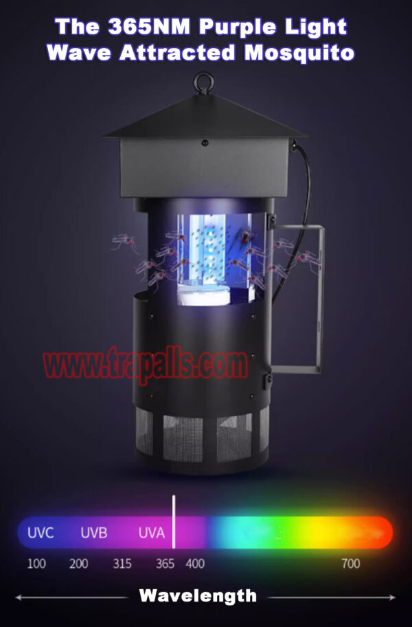 2. Physical mosquito control. It uses 365NM purple light waves to trap mosquitoes