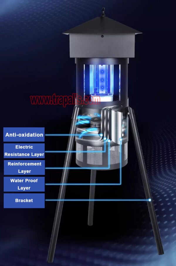 5.The powerful, whisper-quiet fan draws mosquitoes into the retaining cage (or mesh), then mosquitoes would dehydrate and die within 24 hours