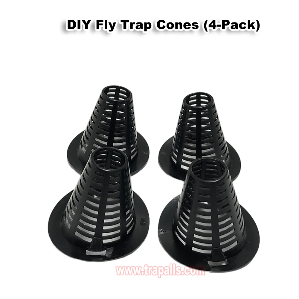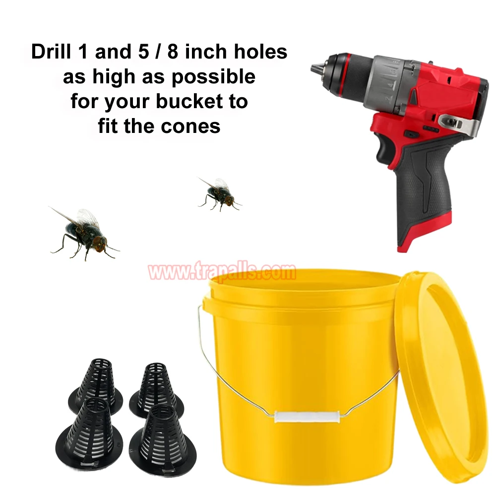 3. Install the DIY fly trap cones. Insert each fly funnel into the pre- drilled hole. Make sure the large end faces outward and the small end faces inward. Press firmly to create a snug, gap- free fit with the bucket wall