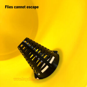 6. Working principle. The scent of the bait diffuses outward through the large entrance, attracting flies to approach and enter the product. Once inside, the flies cannot reverse direction or fly back out due to the funnel geometry