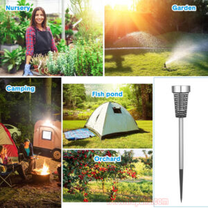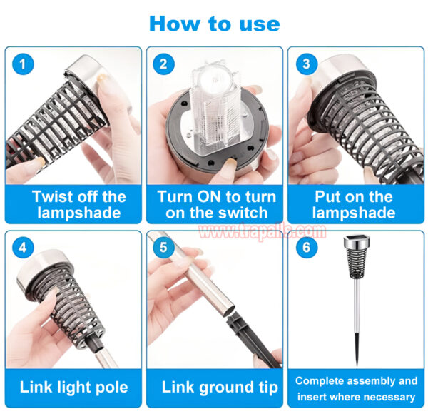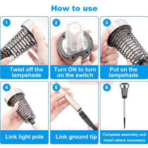 5. Easy to use. Twist off the lampshade, turn ON to turn on the switch, put on the lampshade, link light pole and link ground tip, complete assembly and insert where necessary