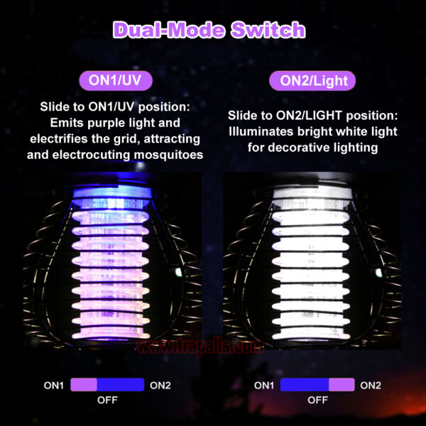4. Dual-mode switch: lighting and mosquito killing. Slide to ON1/UV position: Emits purple light and electrifies the grid, attracting and electrocuting mosquitoes. (Caution: avoid touching the grid with bare hands). Slide to ON2/LIGHT position: Illuminates bright white light for decorative lighting