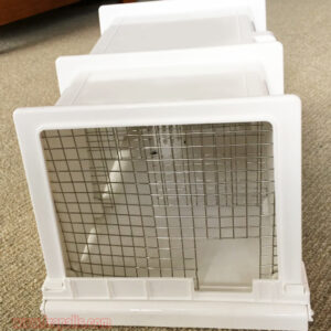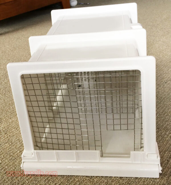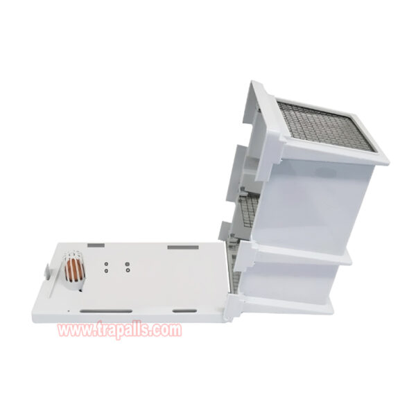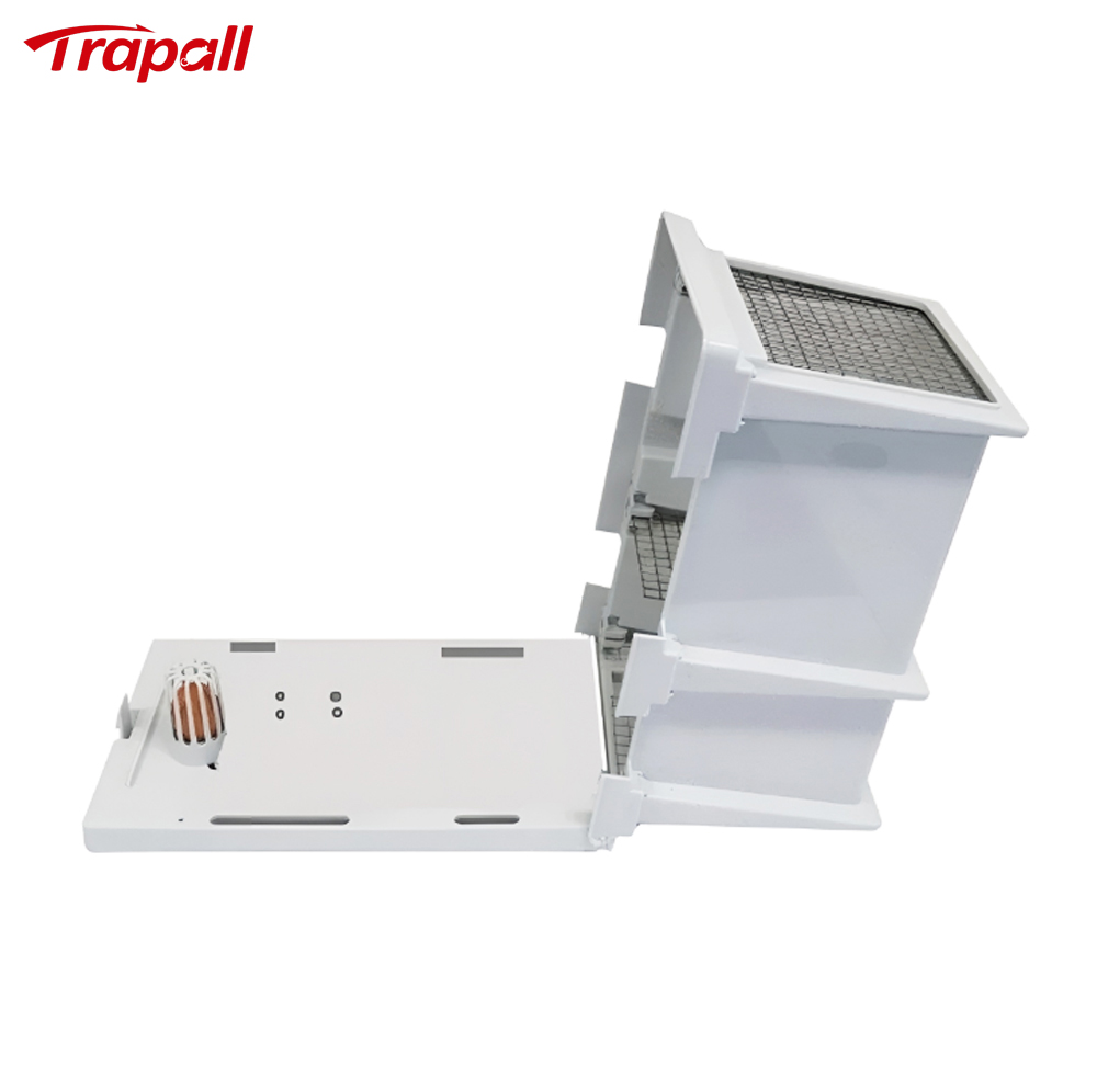 6.This trap includes 3 partitions. Two have juxtaposed openings for pests to travel through chambers. The third has ventilation holds only