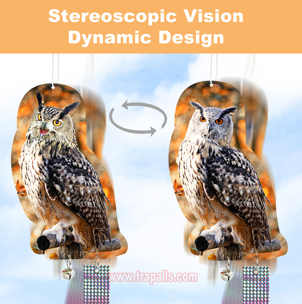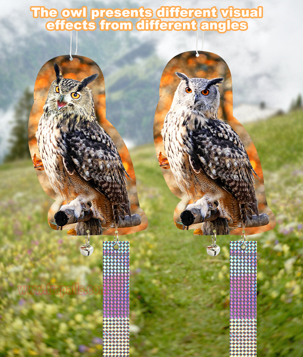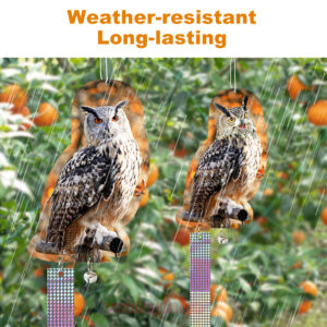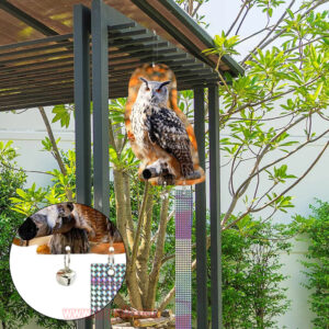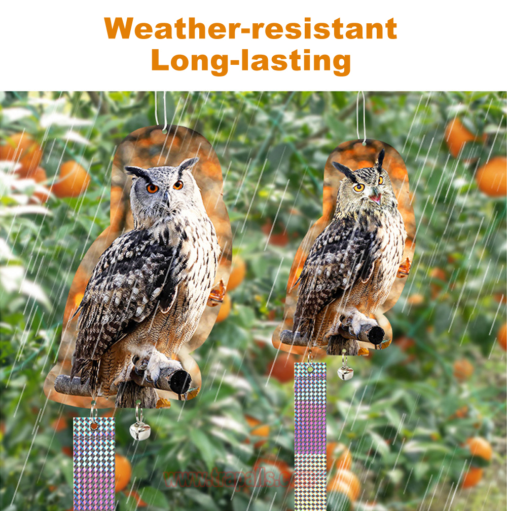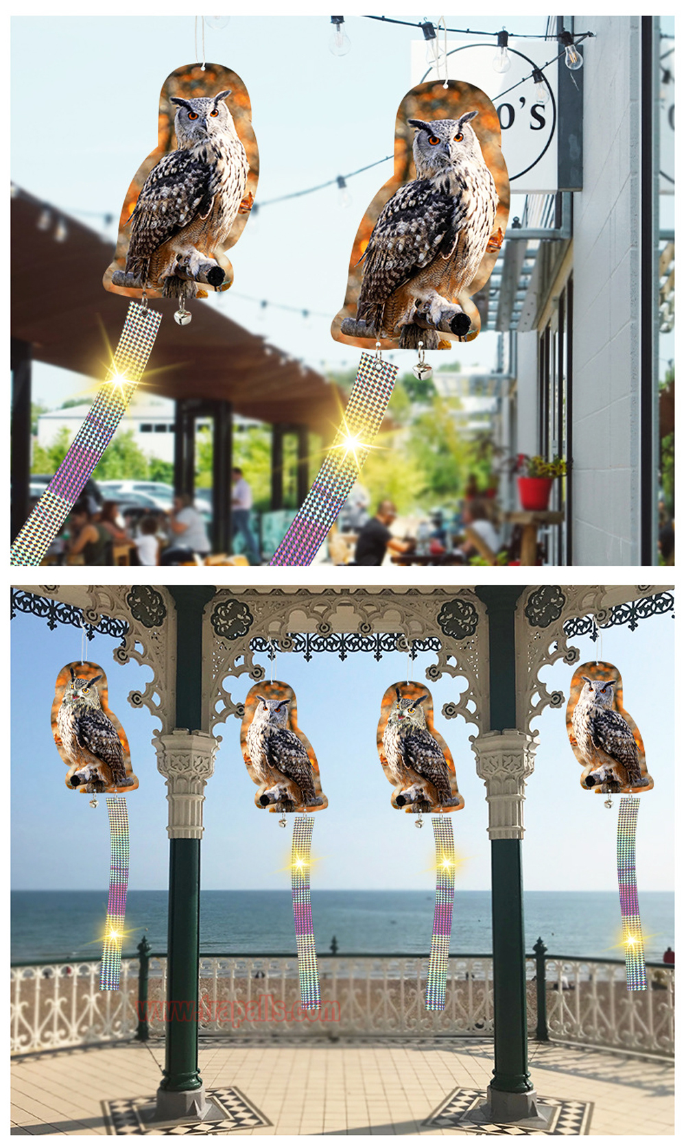 1. Working principle. Utilizing a physical repellent method, it mimics the appearance of natural predators like owls and hawks, combined with reflective strips and bells. It leverages strong light reflection, sound, and predator intimidation to drive away birds such as woodpeckers and pigeons, preventing them from roosting and nesting. The process involves no chemicals, ensuring humane deterrence without harming animals