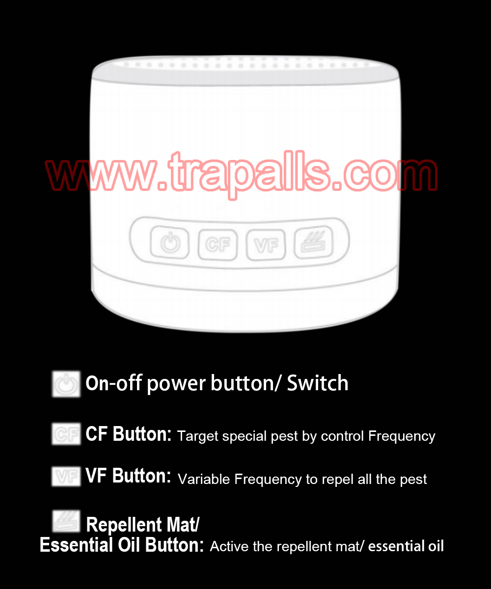 3. Essential Oils + Ultrasonic Feature – It is recommended that the essential oil feature is used either individually or together with the ultrasonic feature of this product to effectively deter pests such as fleas, spiders, mosquitoes, mice, flies and ants