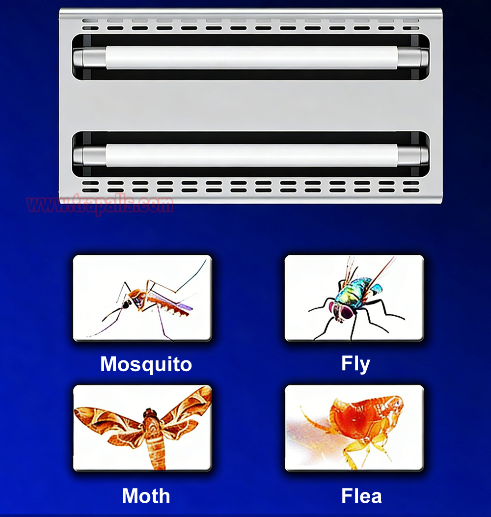 1.Adopts dual-spectrum LED dual-tube design, eliminating the need for frequent tube replacements and ensuring very low operating costs. Effectively attracts flying insects such as mosquitoes, moths, and flies for higher trapping efficiency