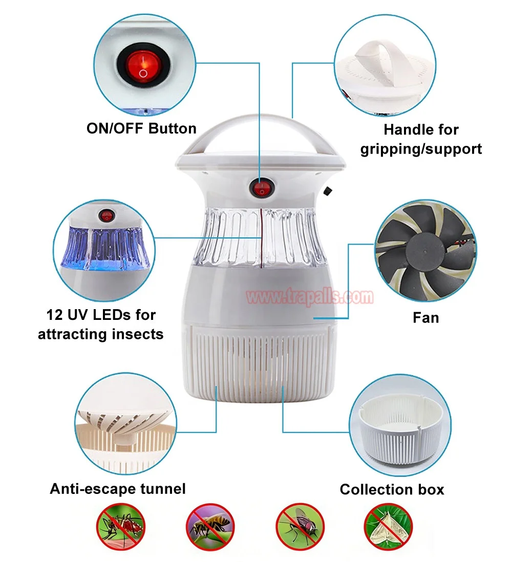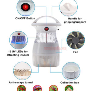5.Working principle: It utilizes UV LED to attract insects, then a DC fan sucks them into the bottom net trap, where they die by dehydration