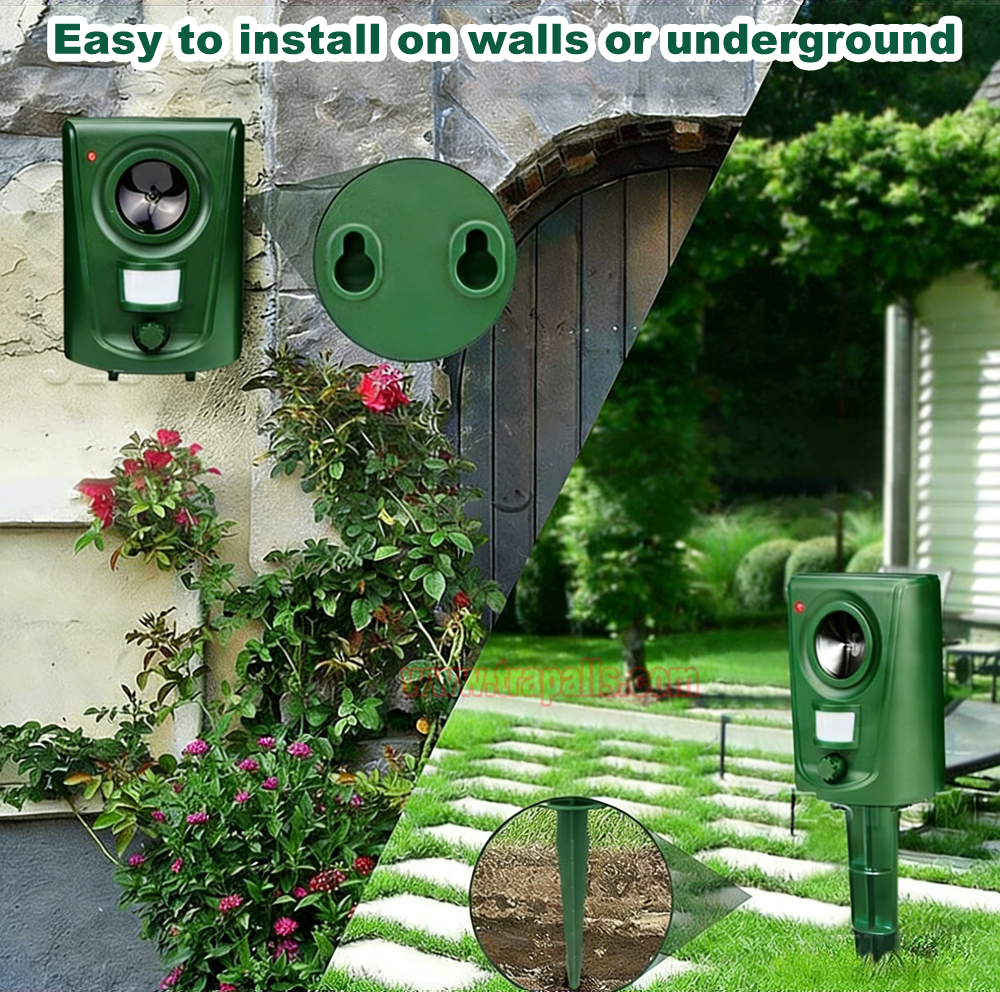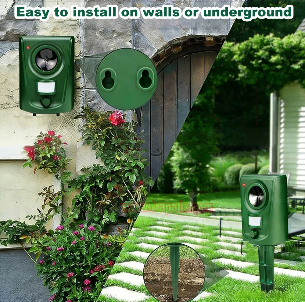 2.Easy to install. Point the animal repeller toward the area you want to protect, select your desired mode, and insert it into the ground