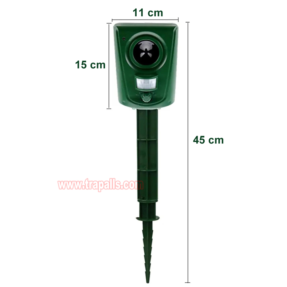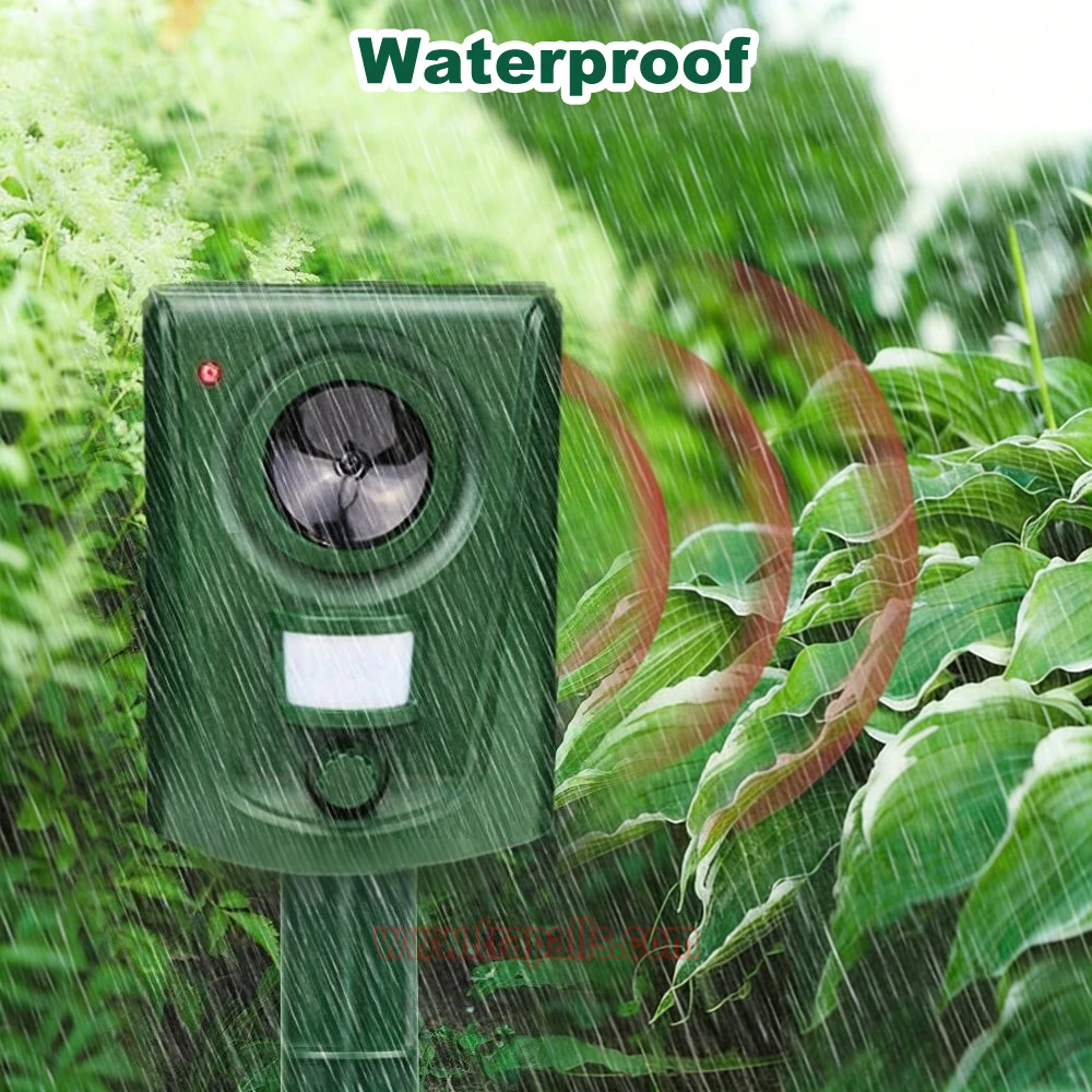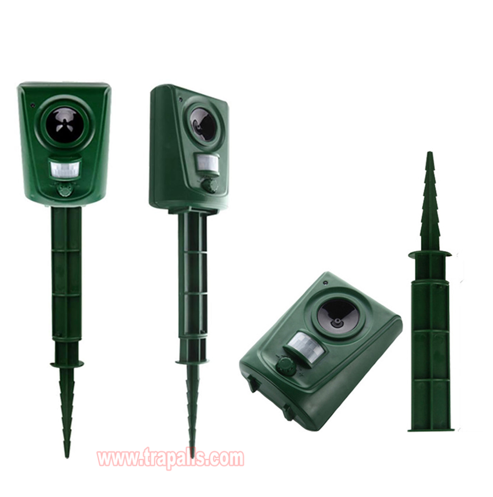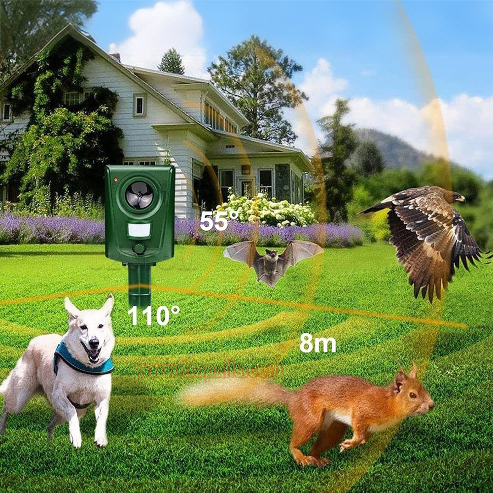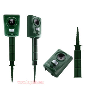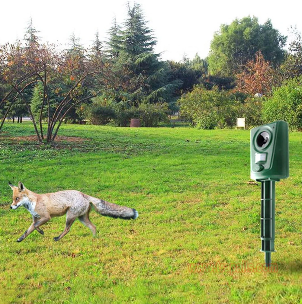 5.This animal repeller scares away unwanted animals and pests using a passive infrared sensor (PIR) that detects motion and triggers the ultrasonic speaker to emit a combination of ultrasonic sounds, sonic sounds, and powerful flashing LED strobe lights