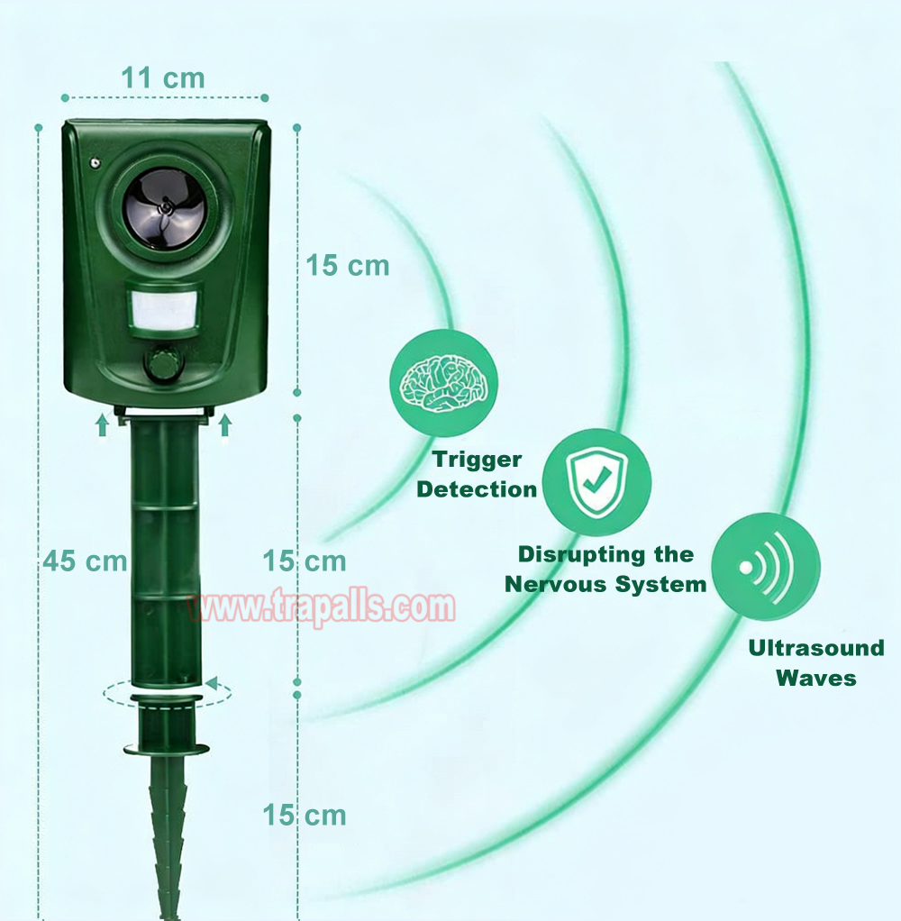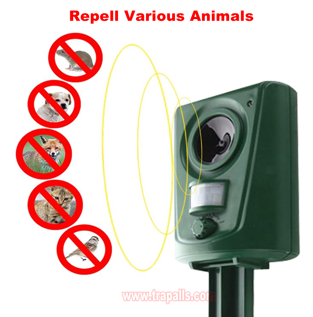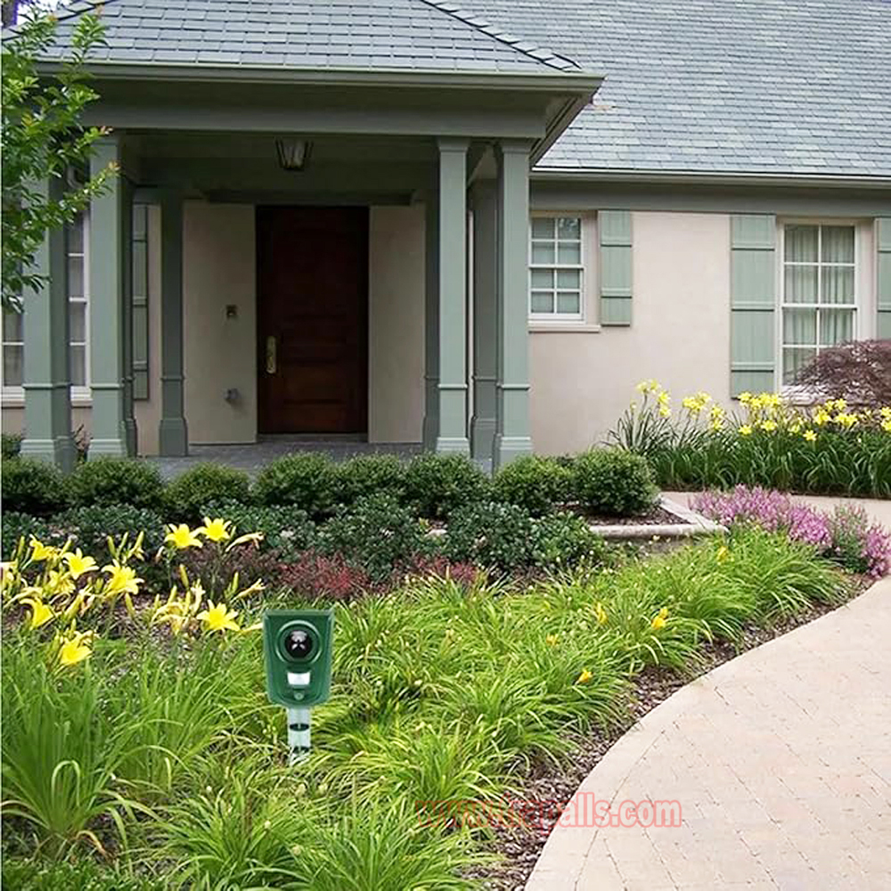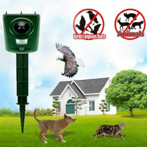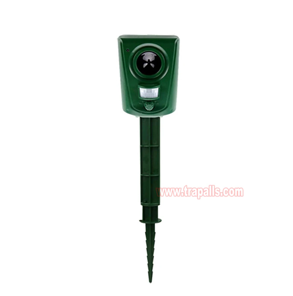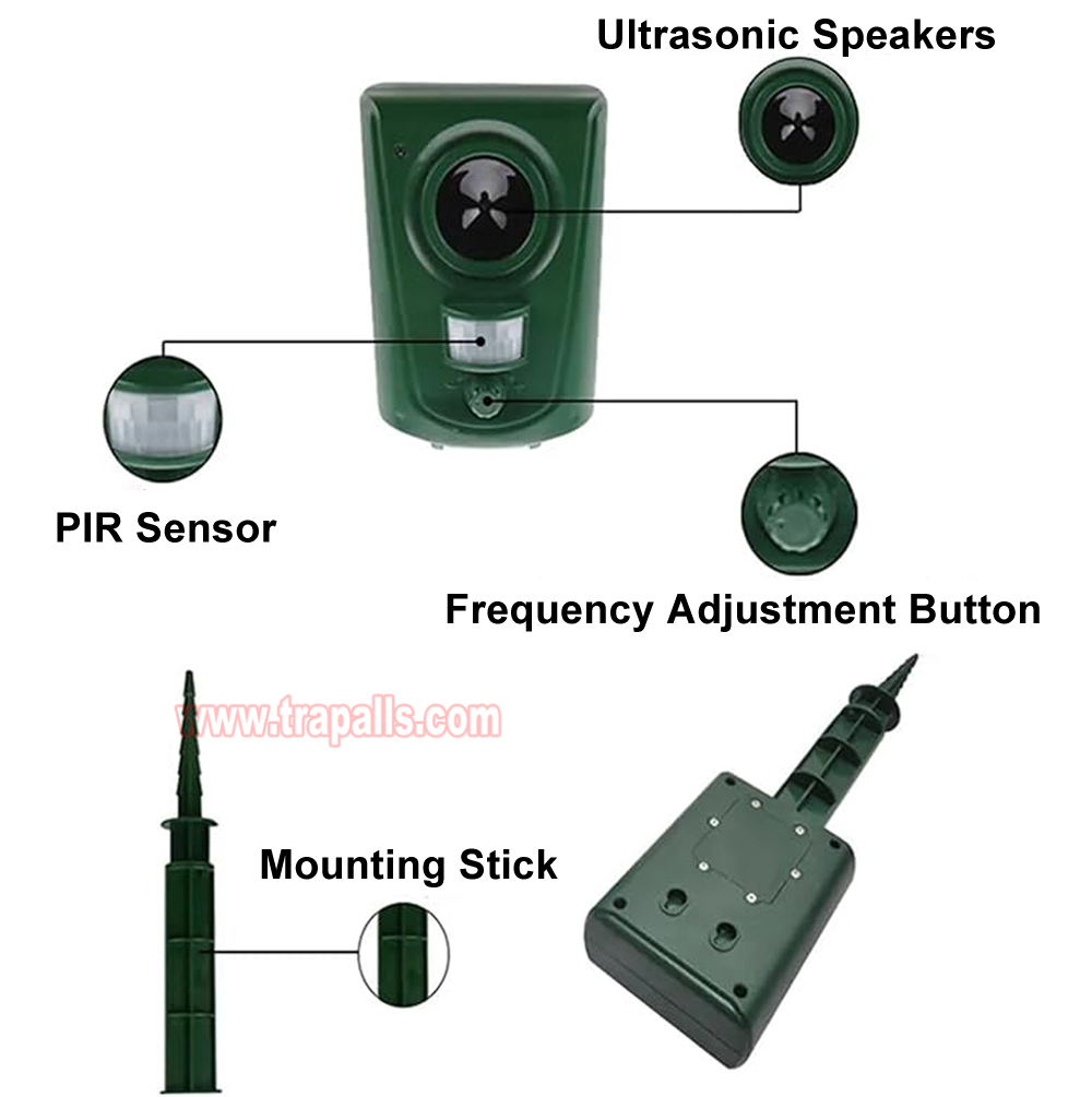 5.This animal repeller scares away unwanted animals and pests using a passive infrared sensor (PIR) that detects motion and triggers the ultrasonic speaker to emit a combination of ultrasonic sounds, sonic sounds, and powerful flashing LED strobe lights