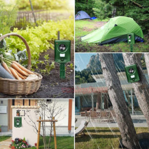 3.It features two hanging holes. Attach the spike stake to the unit, allowing you to hang it on objects such as trees, fences, and walls for optimal performance